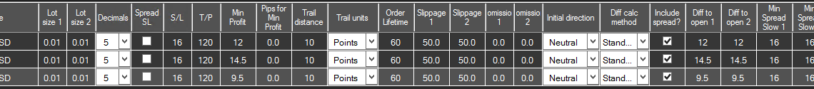 In order for the artificial intelligence to analyze the trading results and select parameters, it is necessary to create a base settings set for the trading instrument – this could be a set suggested by the program by default, and then it should be duplicated several times to create variations of the most important settings with small steps for the most crucial arbitrage parameters as StopLoss (S/L), MinProfit, Pips for Min Profit, Trail Distance and Diff to Open.