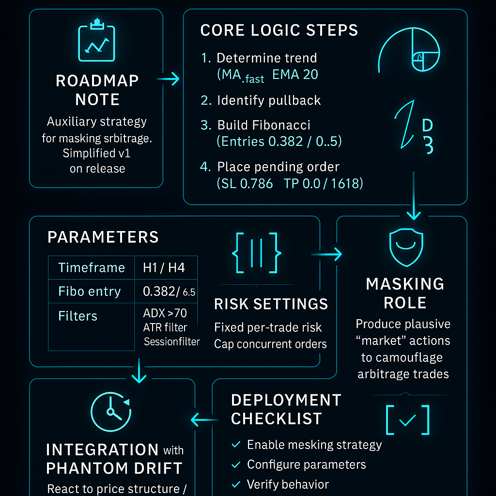 roadmap for an auxiliary strategy designed to mask latency arbitrage. In the initial phase, some modules and ideas will not be implemented. A simplified version will be released first and will make it according to the plan described here, as well as based on your feedback and suggestions. Key idea: this is not a primary profit-generating strategy; it is a tool for plausible masking of arbitrage activity. Its job is to produce a sequence of broker-credible “market” actions (trend- and pullback-based), smooth the account’s behavioral profile, reduce correlation with arbitrage signals, and thereby lower the probability that anti-arbitrage plugins will trigger. Core PnL expectations come from arbitrage (e.g., Phantom Drift); this strategy serves as “decor” and “positive-expectancy noise.”